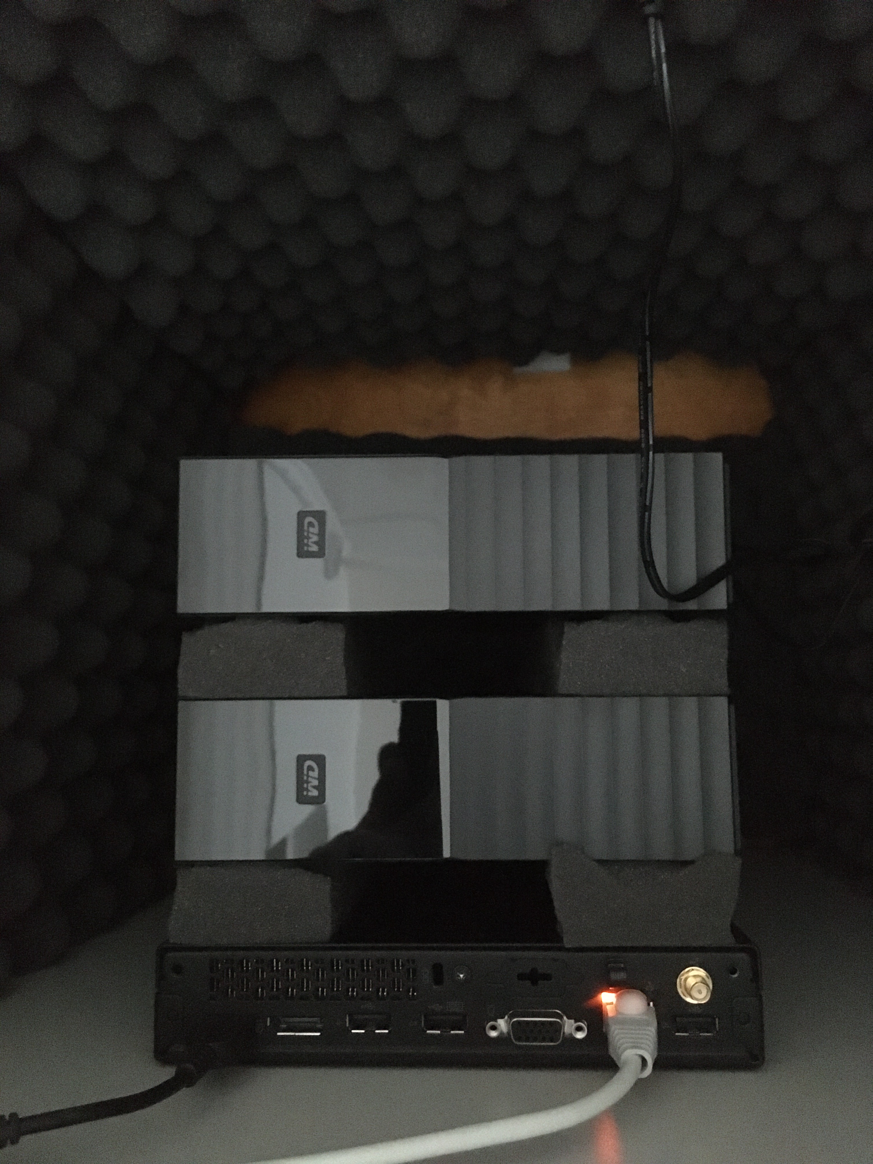After running such a setup for months, enough was enough. I bought some sound dampening foam and used that to try to limit the noise that my setup was making. However, that didn’t do much and the before/after noise comparisons didn’t have much of a difference. As a result of this testing, I did have various pieces of acoustic foam left, and after I noticed that my Lenovo M73 Tiny PC had a similar shape to the WD My Book 12 TB hard drives that I got recently, I had an idea.
