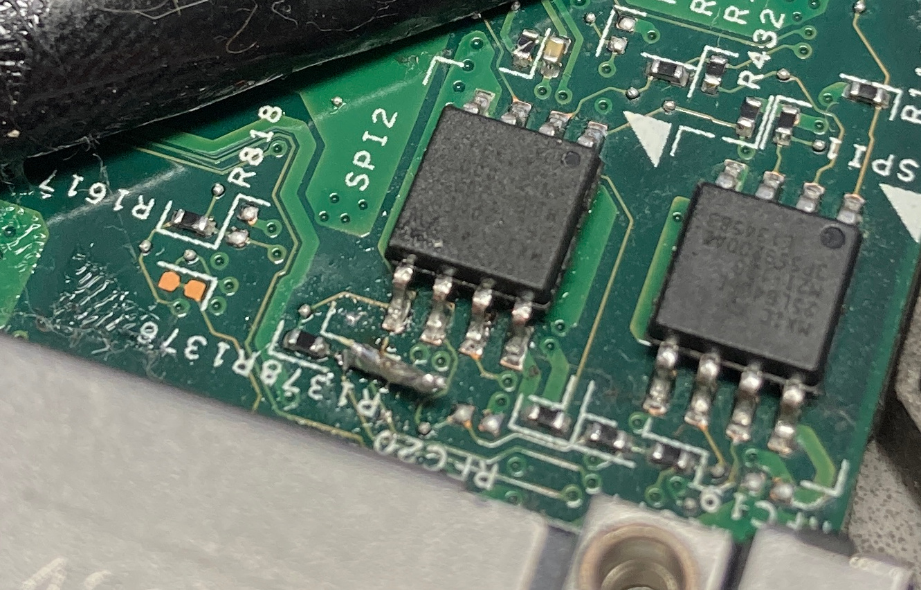 It turns out that during this flashing process, we (probably me) had managed to get rid of a resistor that sat next to the top flash chip. Whoops. Turns out that it was an important one, because over at Reddit, someone else also ran into this issue and had similar symptoms .